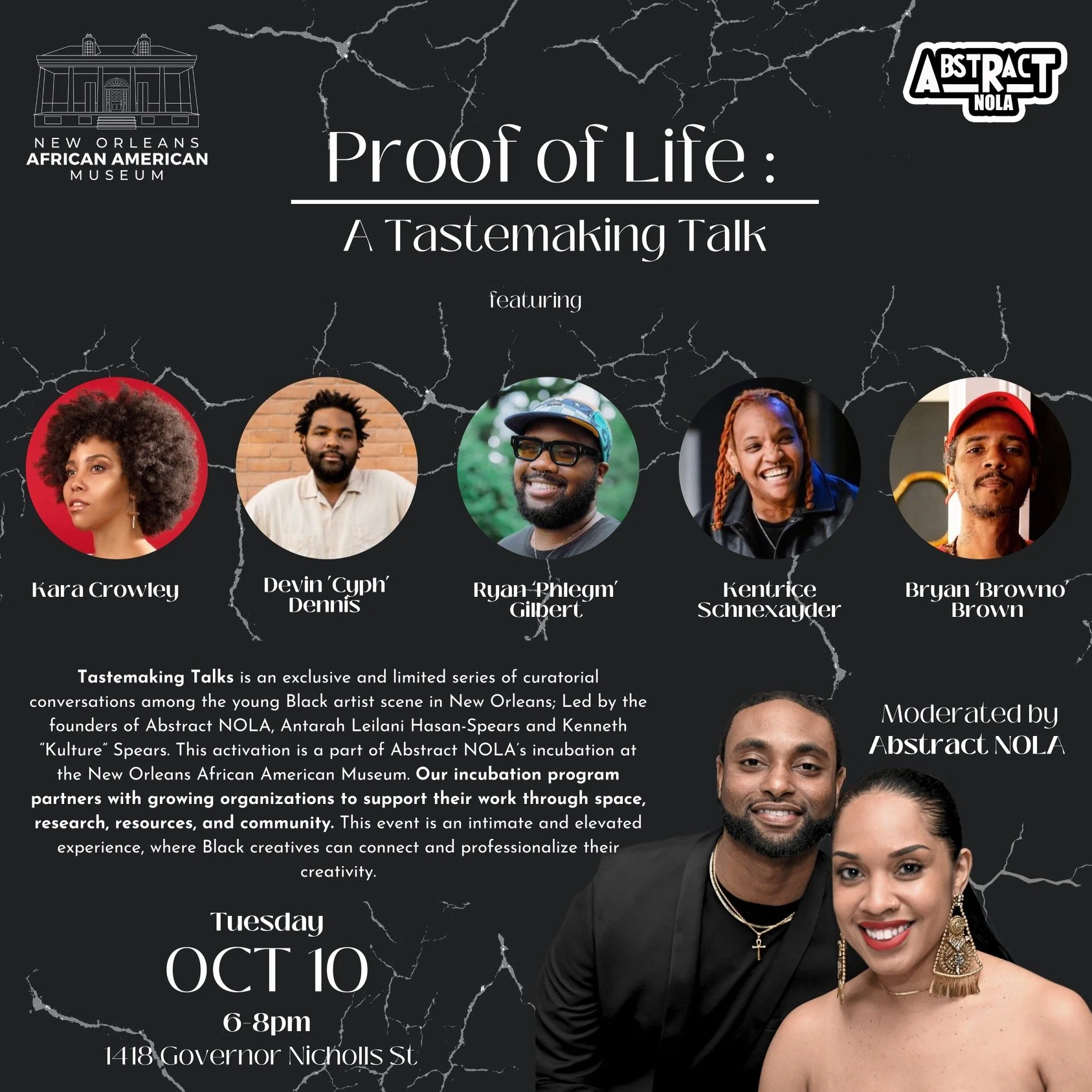 Tastemaking Talks is an exclusive and limited series of curatorial conversations among the young Black artist scene in New Orleans. Led by the founders of AbstractNOLA @abstractnola, Antarah Leilani Hasan-Spears and Kenneth "Kulture" Spears, join us as they delve into their curatorial process of tuning in with emerging artists, during their incubation at NOAAM.